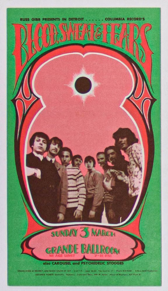 • 1968 G/G-680303 Blood Sweat and Tears The Stooges Grande Ballroom Detroit Postcard Near Mint 81
