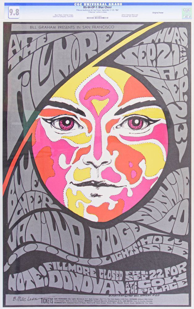 • 1967 BG-84 Blue Cheer Vanilla Fudge Donovan Fillmore & Cow Palace Signed MacLean Poster CGC 9.8
