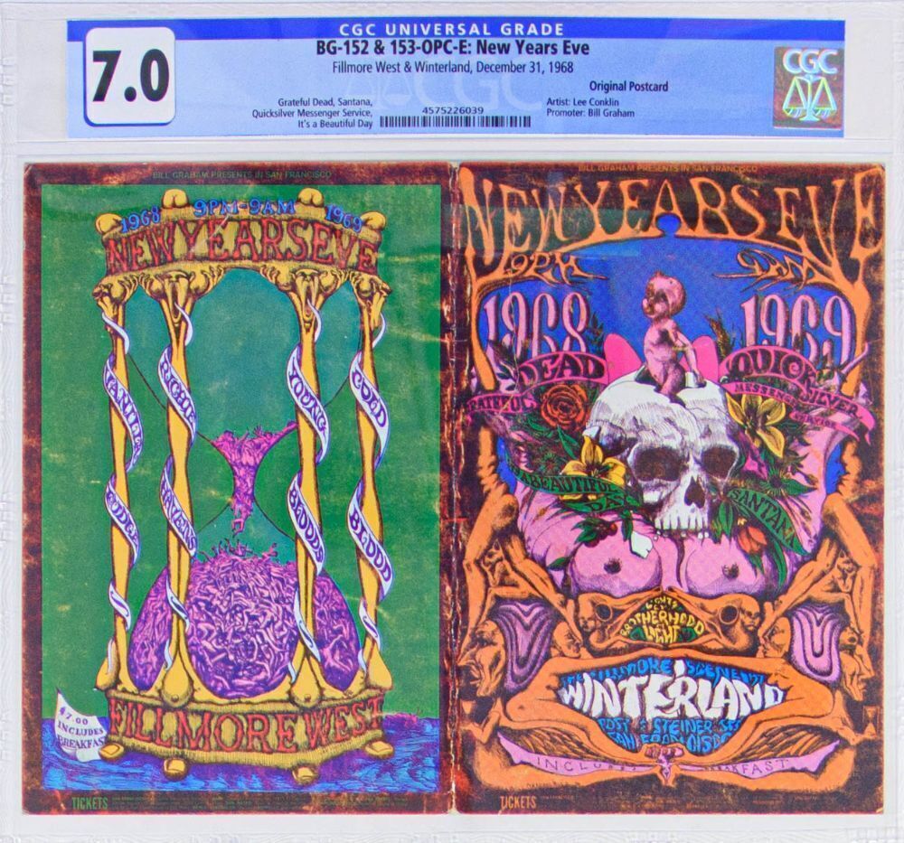 Lot #471968 BG-152 & 153 Grateful Dead Santana Vanilla Fudge Richie Havens NYE Winterland & Fillmore West Double Postcard CGC 7.0